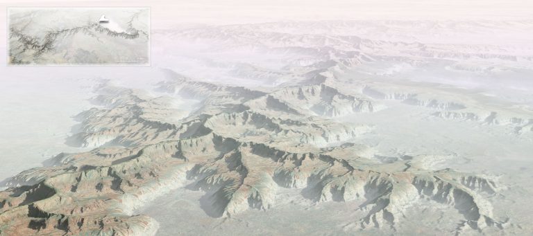 I wondered, then, if flipping the Grand Canyon into a Grand Mountain might in some way help me make sense of its scale. I’m much more accustomed to seeing the mass of something rather than the massive void of something.
