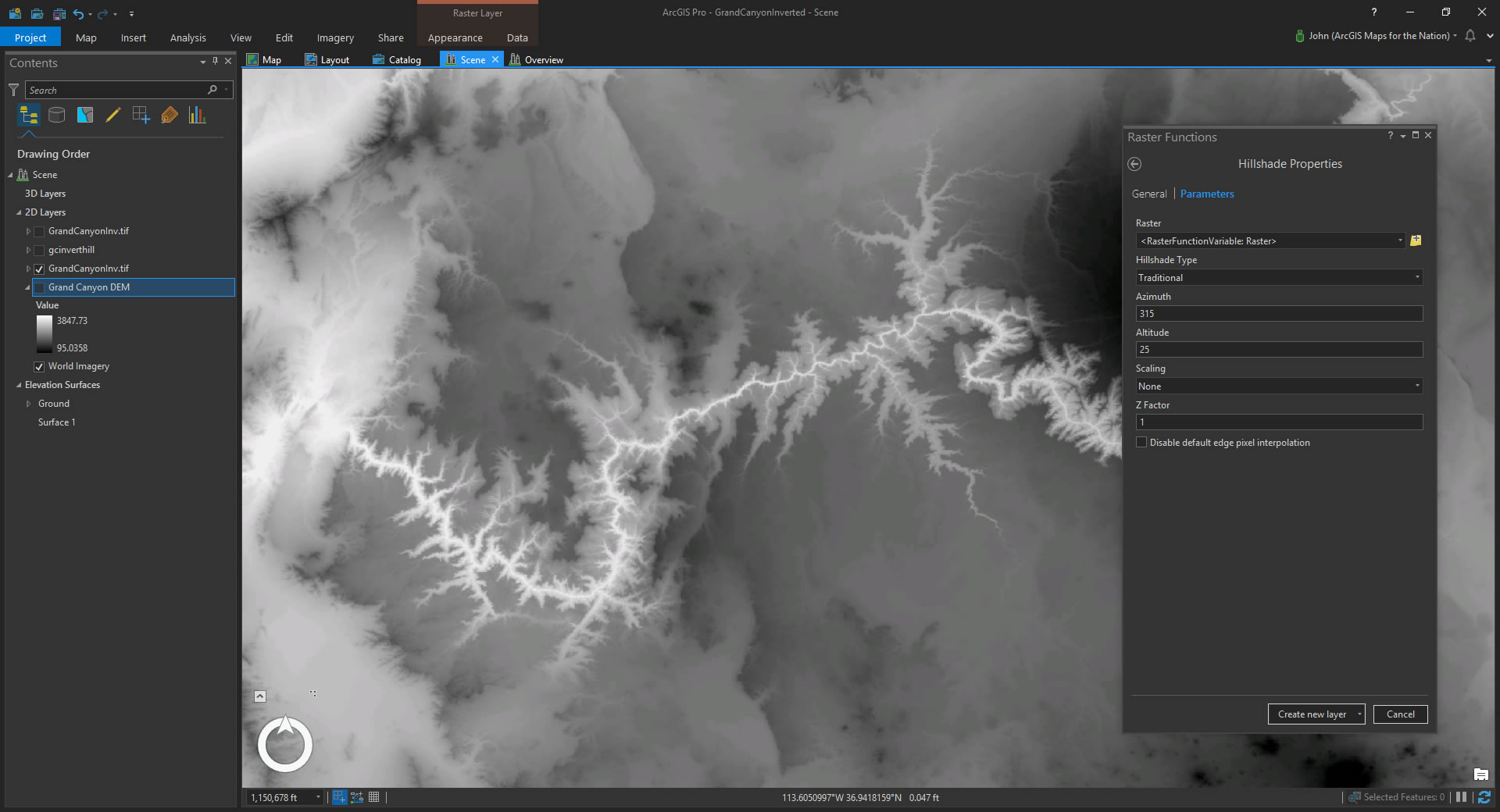 Let’s put on our bizarre-o caps and fire up ArcGIS Pro. Here is a Local Scene with a DEM image of the Grand Canyon area.