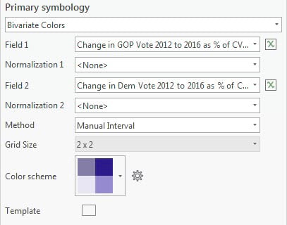 In this blog post, Bivariate Colors symbology was used to map the change in election turnout between Democrats and Republicans for the last two elections. It also looked at variables that could be related to variation in the election outcomes, such as race. The same approach could also be used to map the other variables related to election outcomes (age, education, and so on), and for other types of elections (national, state, or local).