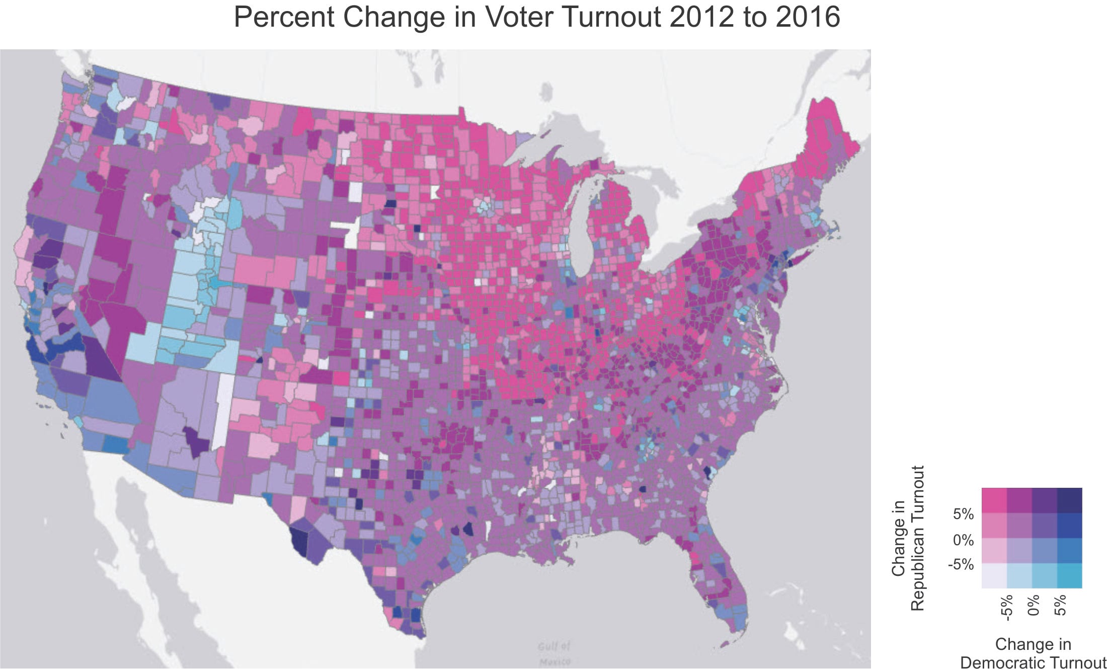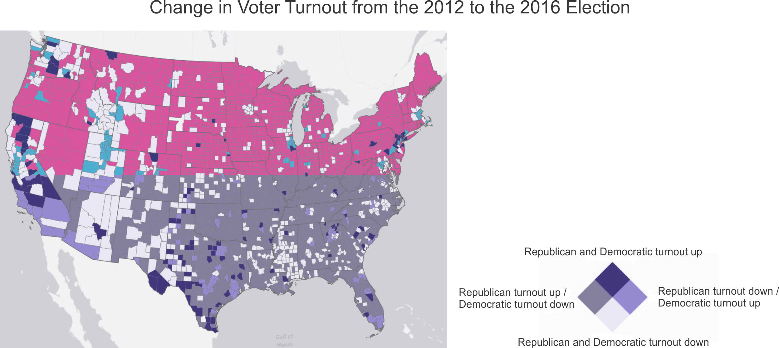 From the map, it’s apparent that in 2016 the vast majority of counties experienced a decrease in Democratic turnout and an increase in Republican turnout (pink).