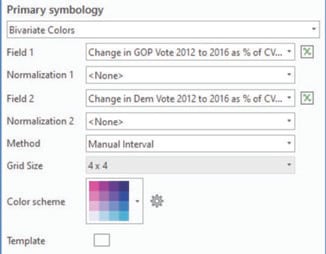 So far, we’ve mapped the relationship between two similar variables: the change in Republican voter turnout and the change in Democratic voter turnout. Bivariate Colors symbology can also be used to map the relationship between two variables that represent different phenomena. This may also be helpful for the GOTV outreach.