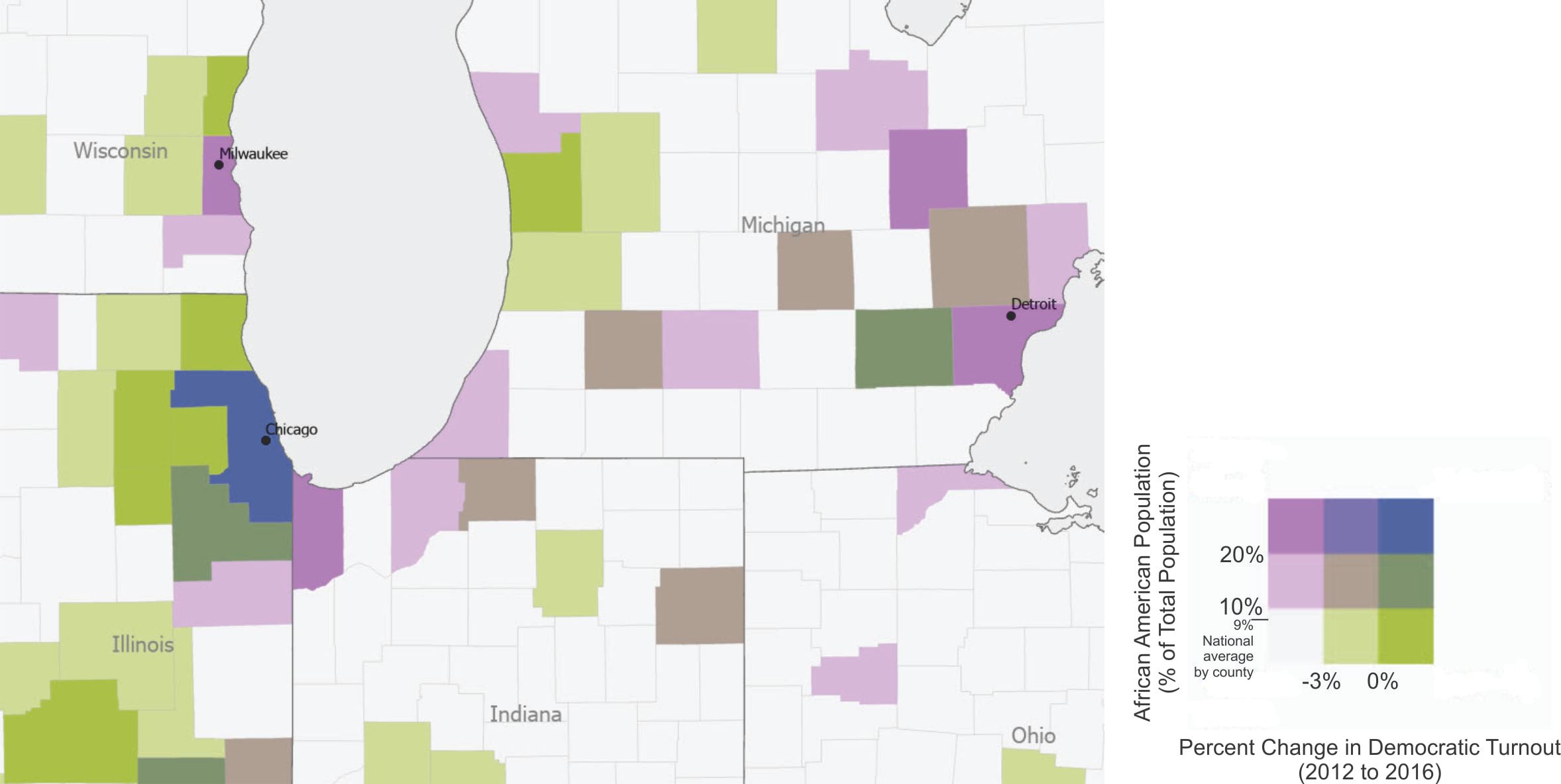 This map shows that the counties where Milwaukee and Detroit are located have a population that is over 20 percent African American, and Democratic turnout in these counties was down over 3 percent. In contrast, Cook County, where Chicago is located, is also at least 20 percent African American, but here Democratic turnout increased between 2012 and 2016. Delving into why these cities and counties had different outcomes could help the Democratic campaign fine-tune its GOTV strategy.