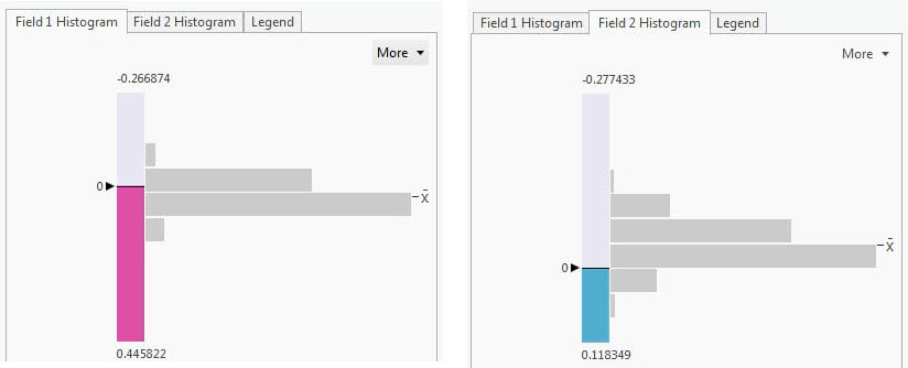 While ArcGIS Pro has several spatial statistics tools for analyzing relationships between two or more variables, a quick way to start exploring relationships visually is to create a map using the Bivariate Colors symbology option to explore the relationship between the values of two variables. On the map below, counties where there was an increase in Republican voters and a decrease in Democratic voters are shown in pink. Cyan counties show where the opposite trend is true. Dark blue shows counties where the turnout for both parties remained the same or increased in voters from both parties. Counties in light purple saw decreases in voters from both parties.