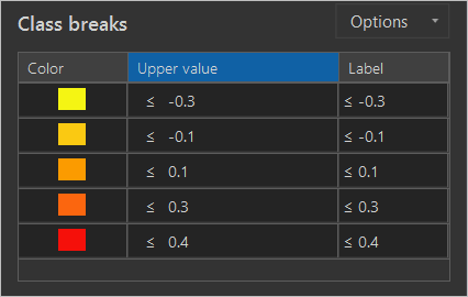12. In the Class breaks section, change the numbers in the Upper value column to -0.3, -0.1, 0.1, 0.3, and 0.4.