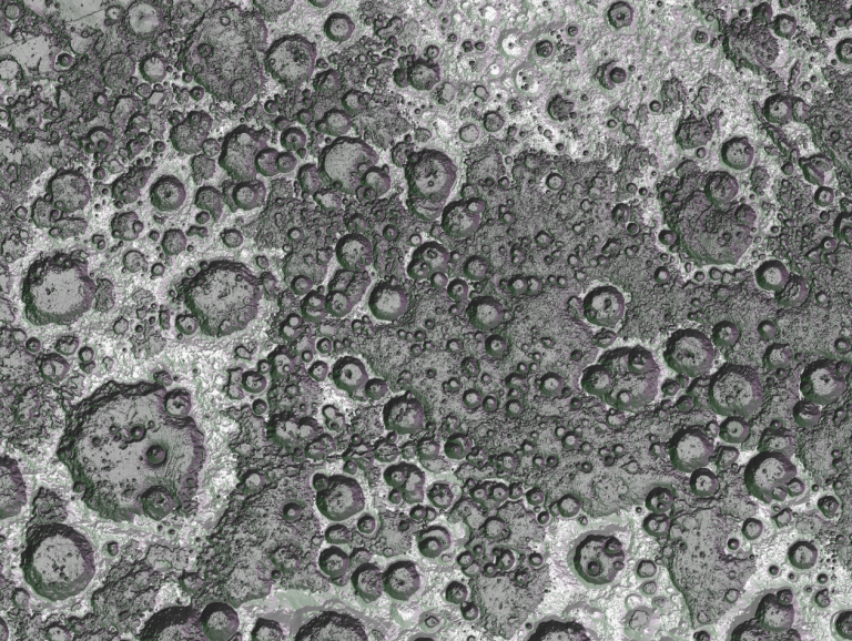 The surface is mostly grey but let’s introduce a little subtle colour. By calculating an aspect surface from the DEM, then recoding it and using subtle blues, greens and purples to represent different aspects you get an abstract landscape. By using a pan-sharpening raster function to combine the hillshade and the aspect layer you can introduce just a subtle hint of colour, making the moon a little bluer and with shifting colours dancing across the surface.