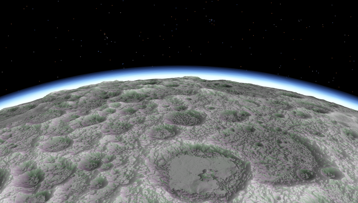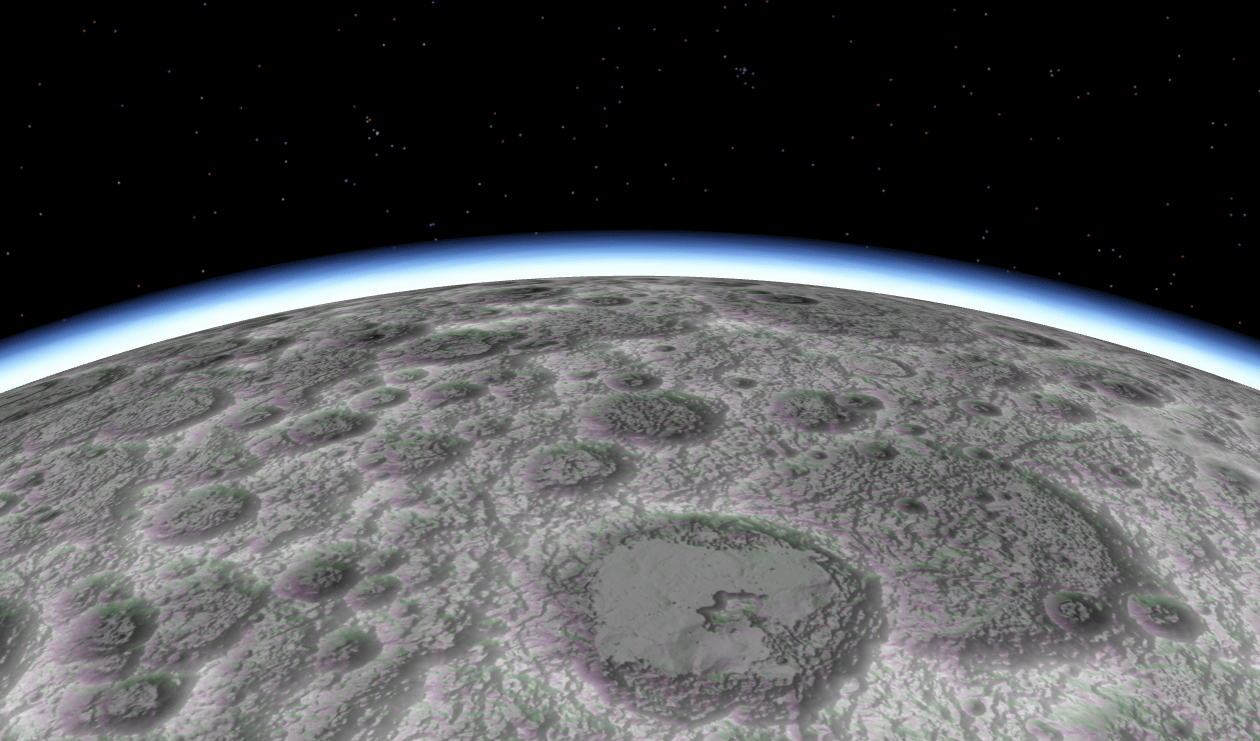 But the real trick to making the surface of the moon more interesting is in draping the colourized hillshade across an exaggerated elevation surface. That’s easy in ArcGIS Pro as you just set the vertical exaggeration on your elevation service and the globe comes to life in a scene.