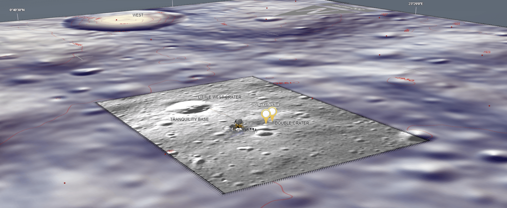 At each of the landing site maps there’s some billboarded marker symbols for various items of equipment, revealed in a popup. The Apollo 11 landing site map goes one better by using an orthophoto for the largest scale because DTM resolution simply isn’t good enough.