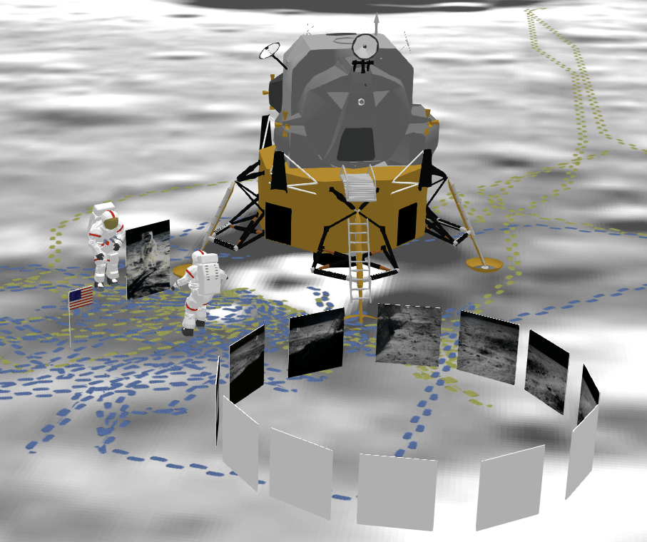 3D models are placed in position for key elements: the Lunar Lander, Neil Armstrong and Buzz Aldrin, positioned where Armstrong took the famous photograph of Aldrin as he was reflected in the visor. The American flag is in position and I’ve also included a few billboarded original NASA photographs. Each of the models and photographs can be clicked to reveal detail in a popup. There’s even an orbiting lunar command module – in its correct orbit of course.