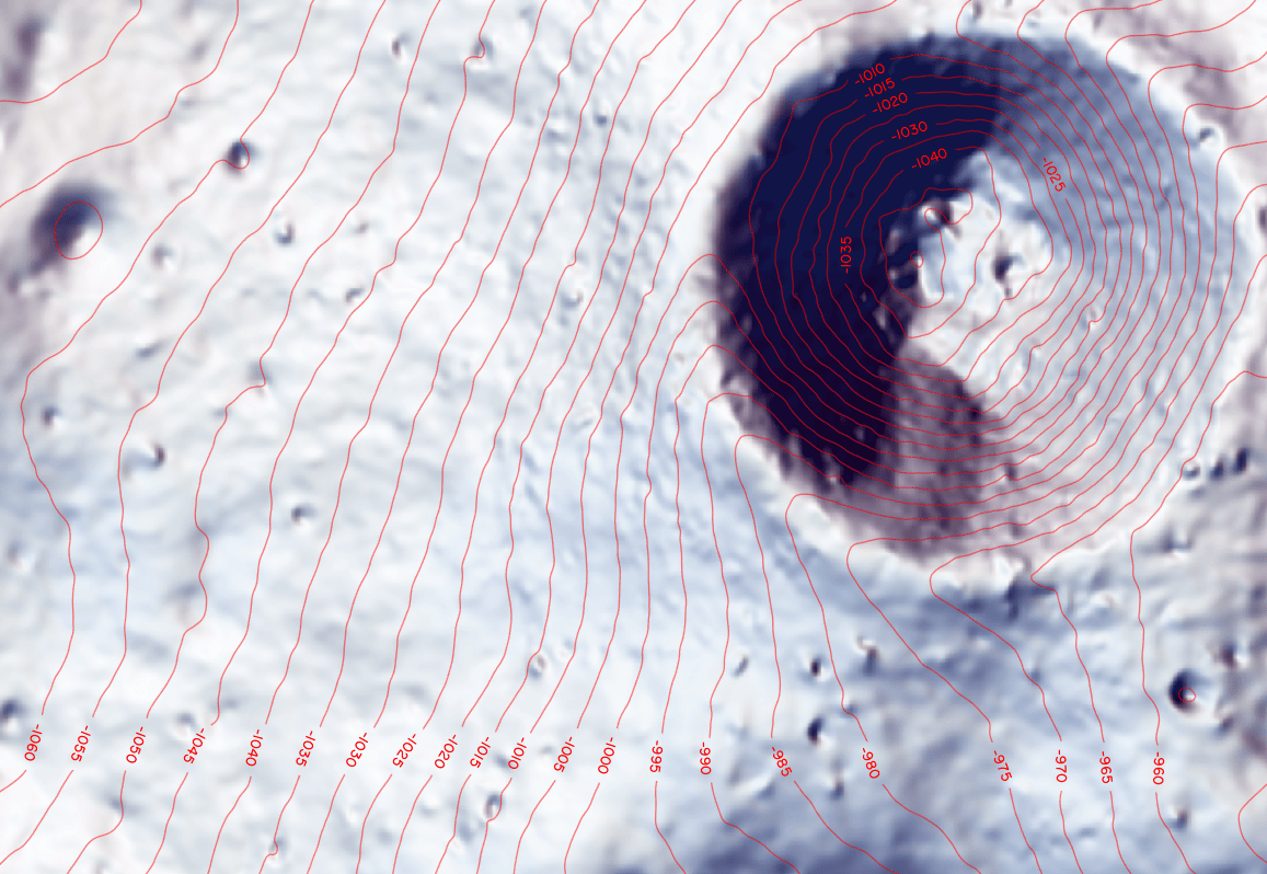 I created contours, using a smoothed version of the landing site DEM to get a good, smooth contour. For the larger landing sites I created contours at different intervals so as you zoom in, you see more detailed contours. Contour labels were dynamically placed, then converted to annotation. Feature Outline Masks were used to create a convex hull around each annotation component and these were used to mask the contour lines, enabling the contour labels to be seen and not conflict with the linework. I chose red for the contour lines and labels to riff off the NASA orthophotomap aesthetic. Labels are placed downhill, and not aligned to the ‘page’ because the globe is interactive and can be rotated at will. Downhill oriented labels made more sense.
