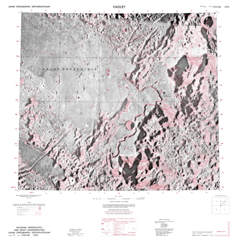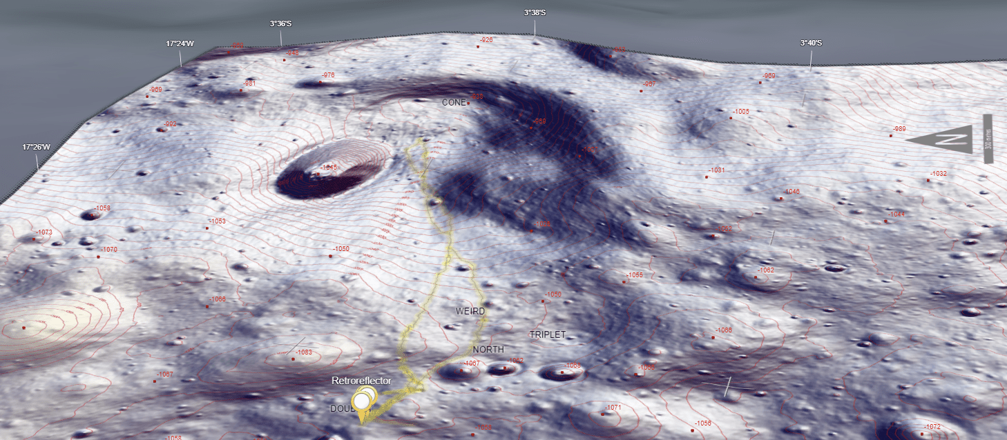 At larger scales things get interesting. I couldn’t use the whole moon DEM for landing sites because its resolution is too coarse. Apollo 11, in particular, has a landing area about the size of a football field. Landing sites got a little larger as the missions progressed (partly because they eventually used a lunar rover to get around) but I still needed hi-resolution data, or something to use as a suitable alternative. I tried to source original NASA maps with the idea that I could just drape them in place. But they were hugely inconsistent because they improved them with each mission as their knowledge and data improved (makes sense), and I wanted consistency. But the orthophotomaps of later Apollo missions are beautiful so I used their general design as my inspiration.