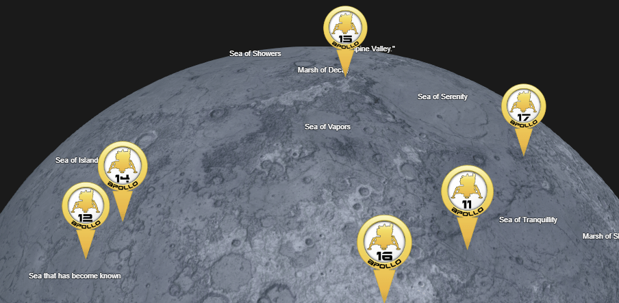 It’s easy to wrap a DEM around a globe but if the map is to provide interest then it also needs contextual information too, like names of features, details of the Apollo missions, and perhaps embedded objects and other media. The Apollo Lunar Surface Journal is a treasure trove of detail for the Apollo missions. And when I say detail, I mean detail. It’s a rabbit warren of all things related to each mission including maps, photographs, transcripts. Additional contextual data and information was obtained from the Lunar and Planetary Institute and the IAU Gazetteer of Planetary Nomenclature. So you end up with a basic data dump of many points of information, from multiple sources across a single DEM. Let’s get mapping!