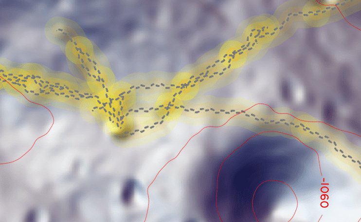 A key component of each landing site map is the activity of the astronauts, and rover. Again, the data exists but why use a boring line when you can design a moonboot footprint and use it as a marker symbol, or even a lunar rover tyre tread, again used as a marker symbol along the line – to scale! For each landing site map, two copies of the extravehicular activity data are used. One has several layers of semi-transparent yellow buffer effects applied. This allows the general pattern of movement to be seen when zoomed out. As you zoom in, the second layer with the footprints, or tyre treads, come into view.