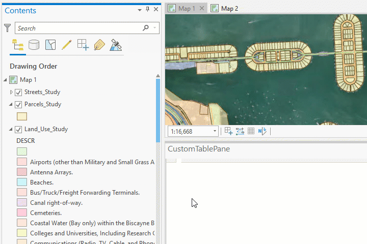 Below is a demonstration of the new 2.3 Table control in a sample from the Map Exploration Team. It shows how multiple attribute tables from multiple maps can be easily visualized from within a custom pane.