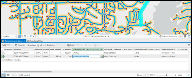 The Dynamic Segmentation tool supports the option to merge coincident events when making edits in the tool. When an attribute in an event is changed and matches the attribute of an adjacent event, this option will automatically merge the events into a single event.