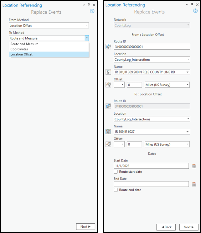 Users can now utilize intersections as an offset method in addition to route and measure within the Event Replacement tool. If referent offset fields are configured for any event layer with new records being added, this intersection offset information will be stored for the new events along with route and measure information.