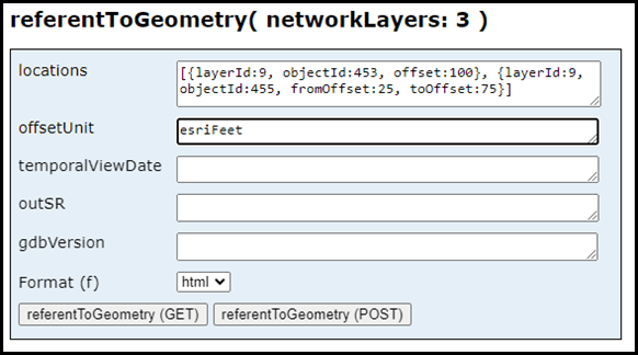 The new referentToGeometry REST operation allows a user to provide one more point referent locations along a set of routes that are converted into coordinates and route and measures. This operation is useful for users who want to convert linear referenced information that was collected via a referent and offset, such as 50 feet from a milepost location, into route and measure and coordinates to be easily managed within Roads and Highways.