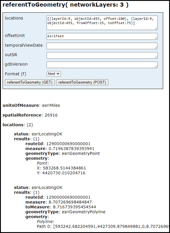 The new geometryToReferent REST operation allows a user to provide one or more coordinates or route and measure locations along a route and have those locations converted into a referent and offset value. The user can choose the referent layer that will be used to convert the inputs. This operation will be useful to organizations looking to convert the location of linear referenced features into a location that is more easily identifiable to team members working outside the office.