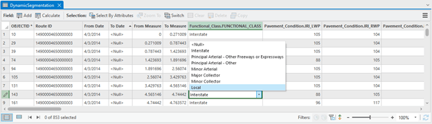 The Dynamic Segmentation tool allows you to dynamically segment multiple LRS events and visualize them in the map and in a table. The table is editable, allowing you to edit the attributes in the fields within the table. The resulting changes from those edits will be stored in the LRS event record(s) that contributed to the dynamic segmentation and are reflected in the updated dynamic segmentation table.