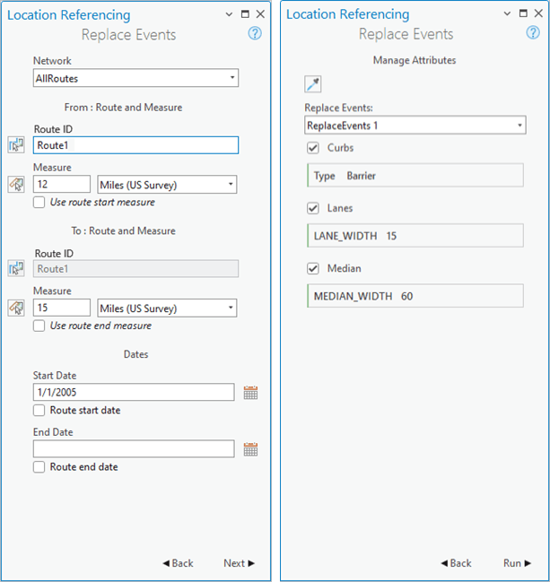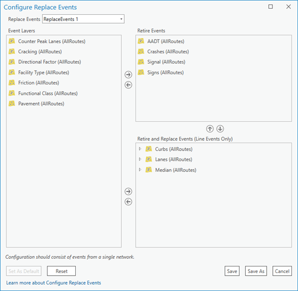 The event replacement tool allows you to configure multiple LRS event layers that can be either retired or retired then replaced when a road is updated without a change in measure or geometry, such as during a repaving or widening project. Events configured to retire will retire if they’re located within the section of road being replaced. Events configured to retire and replace will be retired on the date of the replacement and a new record (with updated attributes) will be created.