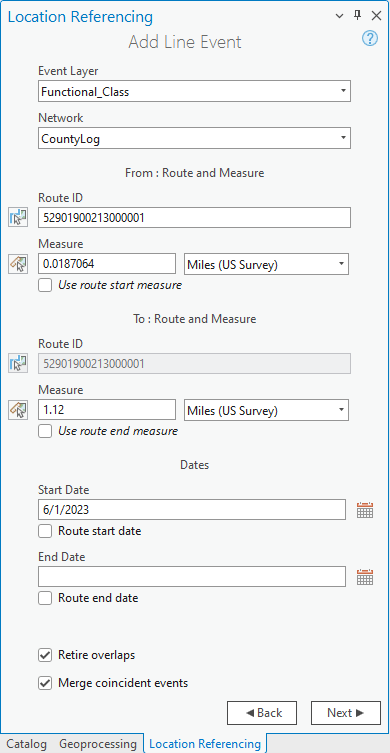 The Add Line Event tools have been enhanced to support options to retire overlaps and merge coincident events. Retire Overlaps will automatically retire existing events that would overlap in time and location with any newly added event created by the tool. Merge Coincident will consider any adjacent events that share the same attributes as the event being added and will automatically merge them into a single event to prevent unnecessary segmentation of event data.