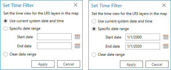 If you don’t need to take advantage of all the ArcGIS Pro time capabilities on the Time ribbon, the Set Time Filter tool on the Location Referencing ribbon allows for easy configuration of the time view of LRS layers in the map. You can set the time on the map to a specific date (including the current date) as well as any range of time.