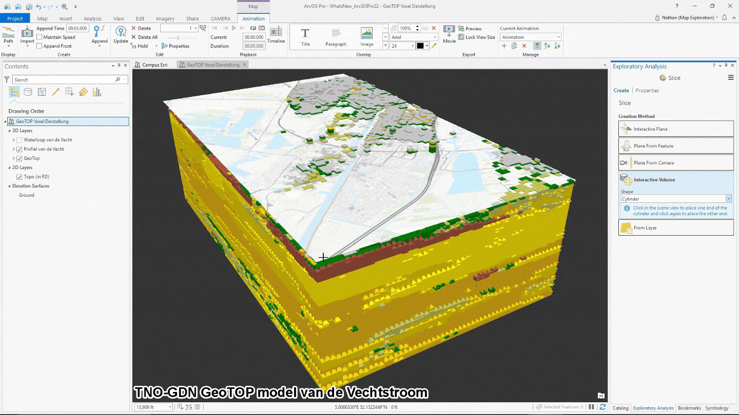 Explore content hidden behind or within other content with the new interactive 3D exploration tool, Slice. You can slice through content in your scenes using planes or volumetric shapes. Slice is included among the other Interactive Analysis tools in the 3D Exploratory Analysis tools introduced in ArcGIS Pro 2.1.