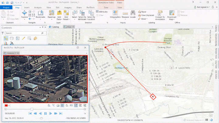 Play and analyze full-motion video (FMV) data that is geospatially enabled with the ArcGIS Image Analyst extension. Enable the projection and display of the video frame footprint and sensor position on the map while the video plays. You can also collect features in the video player and visualize them on the map, or collect features in the map and see them displayed in the video player.