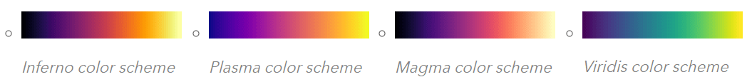 Inferno, Magma, Plasma, and Viridis scientific color schemes are now included in the ArcGIS Colors system style. These color schemes are particularly useful with imagery, LAS symbology, unclassed, and graduated colors symbology. They are also effective for grey scale environments and color-blind users.