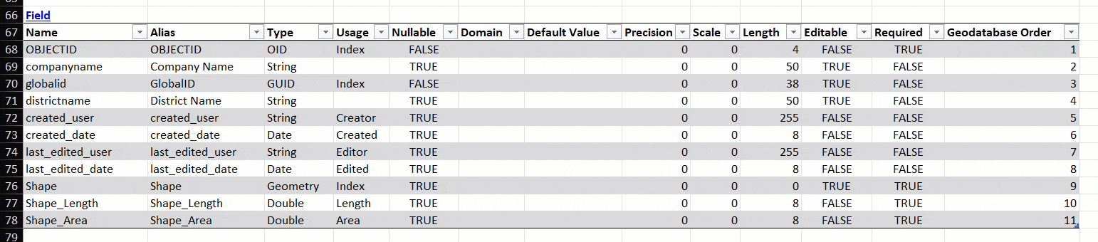 Rearranging fields can be achieved in two ways. You can cut and insert rows to reorder them, or you can sort the fields using the geodatabase order column. The geodatabase order field has no direct effect on the schema and only serves to sort the table. For instance, if you change the values in the geodatabase order field but do not sort the records in the table, the field order will be left unchanged in an XML output. Sorting is key to making this edit. Assigning numbers in the Geodatabase Order field will not result in a new field arrangement without it. This is true of tables throughout the report.