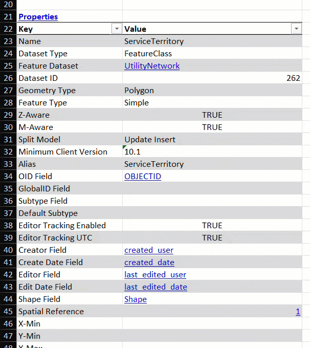 This worksheet contains the schema information for the Service Territory class. Properties of the class can be edited in the properties table, which starts on row 22. Class properties like name, alias, and geometry type can be edited by typing a new value into the cell. The GIF below shows an edit the class alias, changing it from ServiceTerritory to Service Territories. You’ll also see the geometry type changed from polygon to point. Changing the fundamental properties of data must be done carefully. Changing the class geometry type from a polygon to point will save successfully, but may not produce a schema with valid associations or functionality when converted to a new geodatabase.