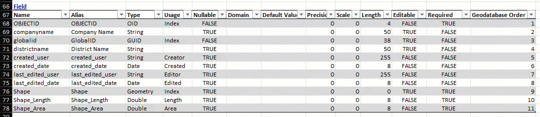 Field properties are edited in the same manner as the class properties, by typing a new value. All field properties in this table are editable. When changing the names of fields, references to the field must also be updated to maintain the reference. For instance, if the field is used as a key field in a relationship class, the name of the key field in the relationship class also must be updated to reflect changes made to the field name. It is recommended that you use the Excel find all shortcut (Ctrl+F) to locate all references to the field in the workbook. In the GIF below, the field name, alias, and nullability of the field named companyname are changed.