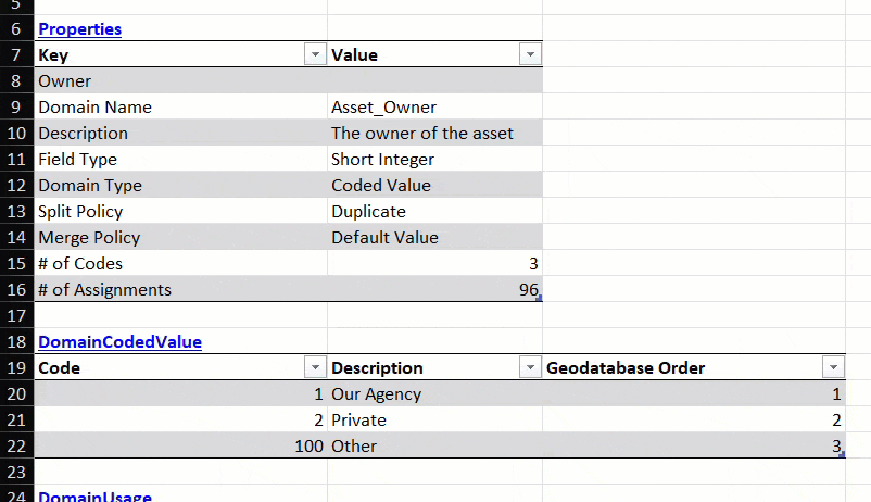 Additional geodatabase features like domains and spatial references also have individual worksheets you can edit. In the Subtype Field Info table in cell E154, click the hyperlink for the Asset_Owner domain to navigate to the domain’s worksheet.