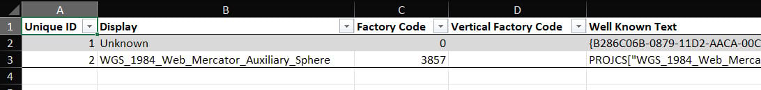 To add an additional coordinate system, add a new row, provide a new unique ID for the row, and copy the Esri well-known text of your preferred coordinate reference system into the well-know text column. The coordinate reference sheet uses the well-known text to define the coordinate reference system. Rows for new coordinate systems must contain a valid value for this cell. Values in the factory code column are for display only and will not affect the resulting spatial reference during conversion.