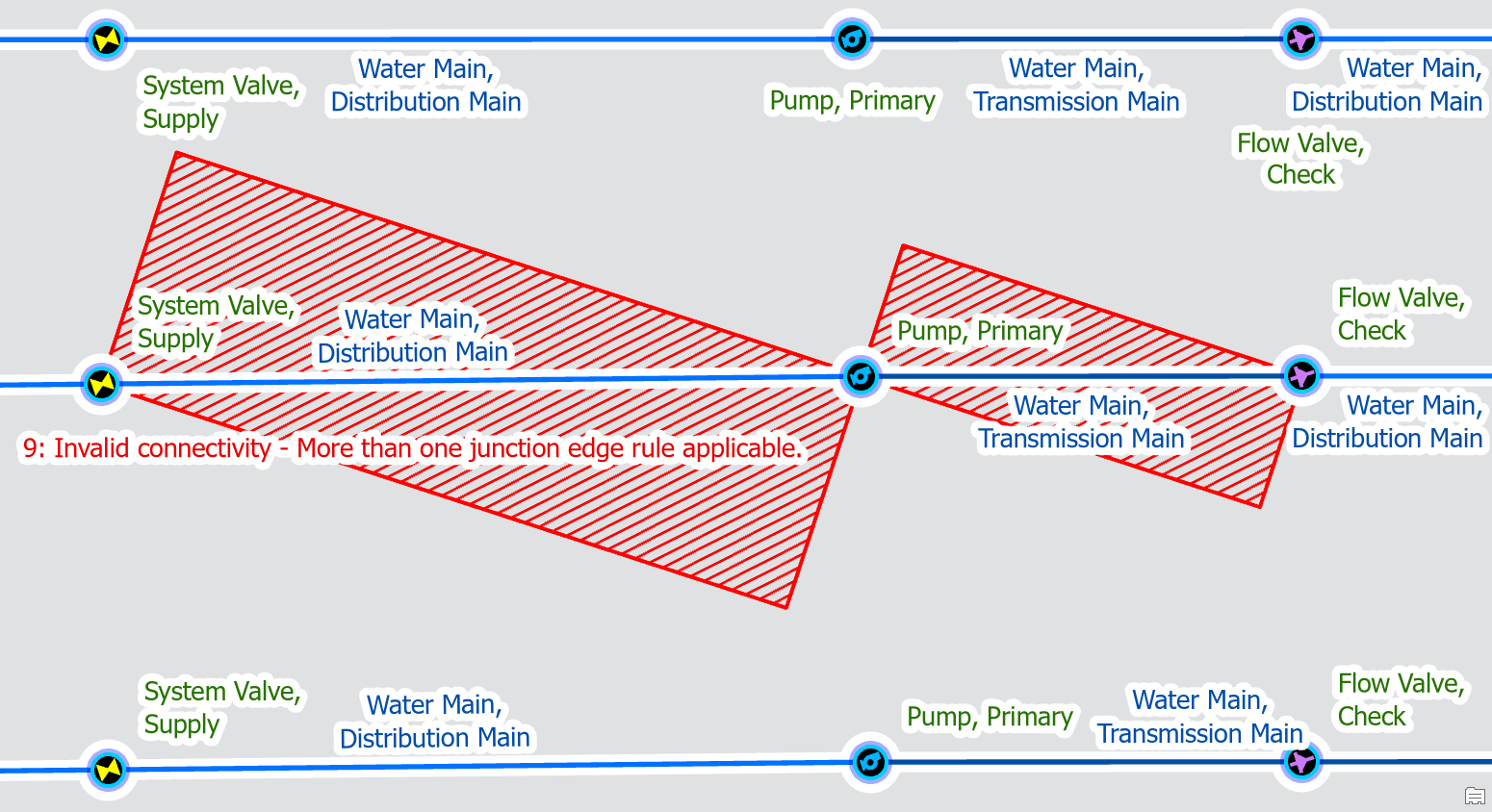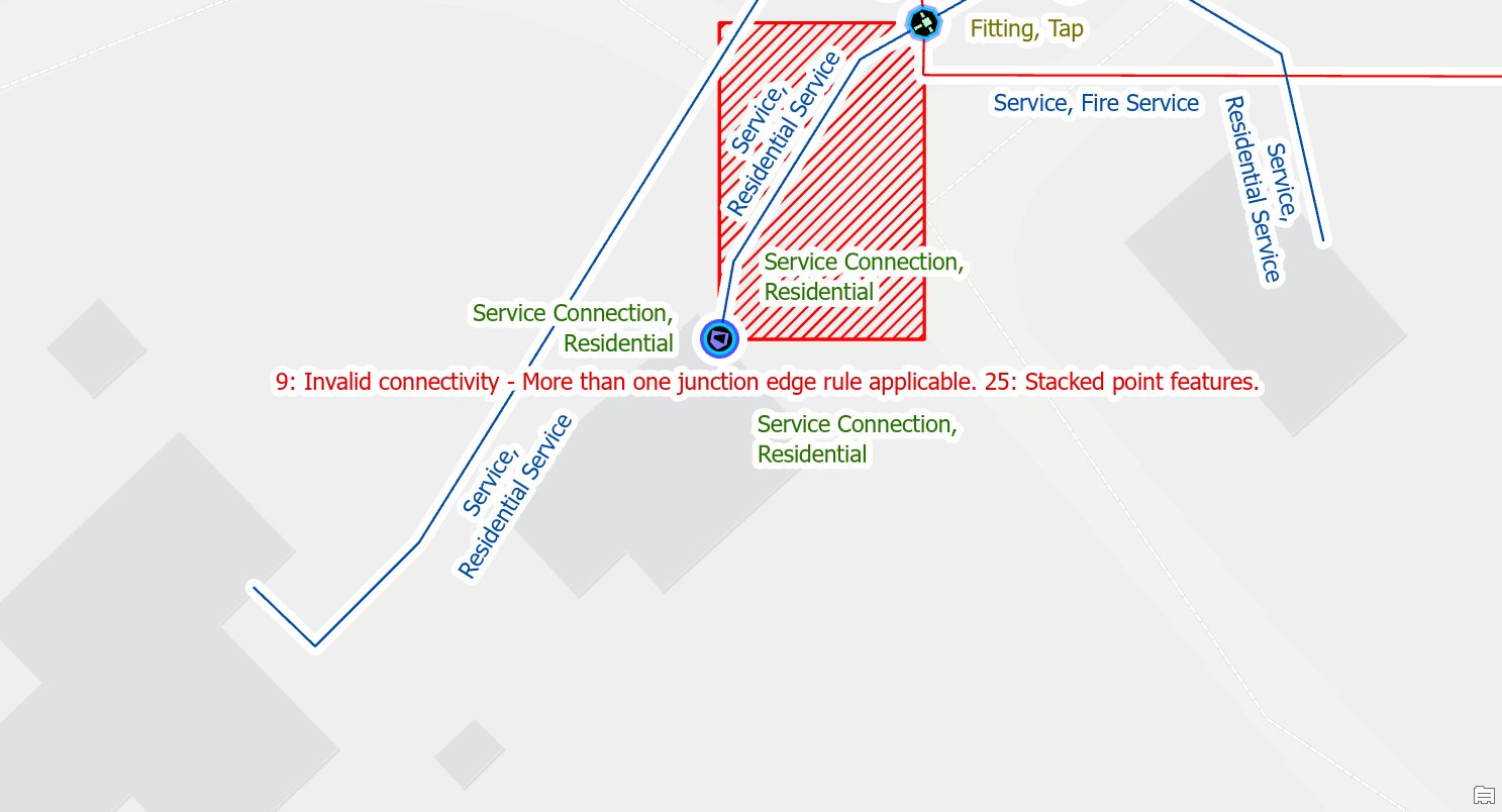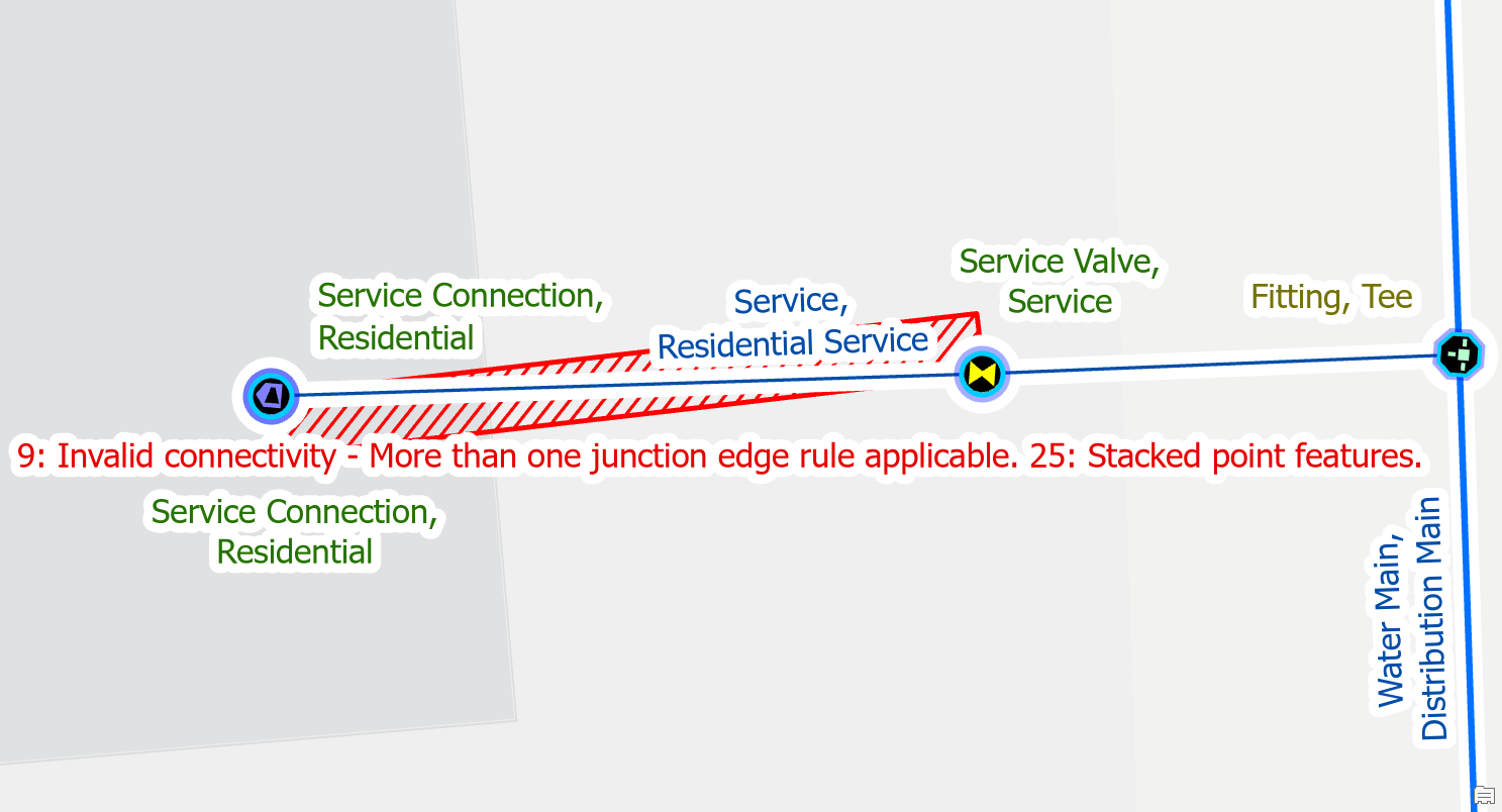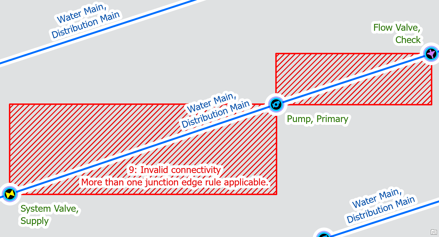 - Ambiguous connectivity error because the junctions and lines each have multiple rules