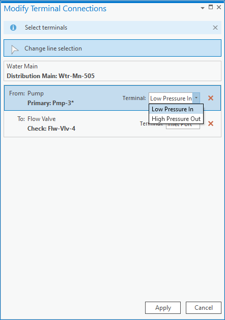 This will ensure that transmission mains are always connected to the high-pressure outlet, automatically connect them to the correct side of the pump. Because distribution mains can be connected to either terminal, you must still use the Modify Terminal Connections pane to specify that in this instance, this distribution main is connected to the low-pressure inlet.