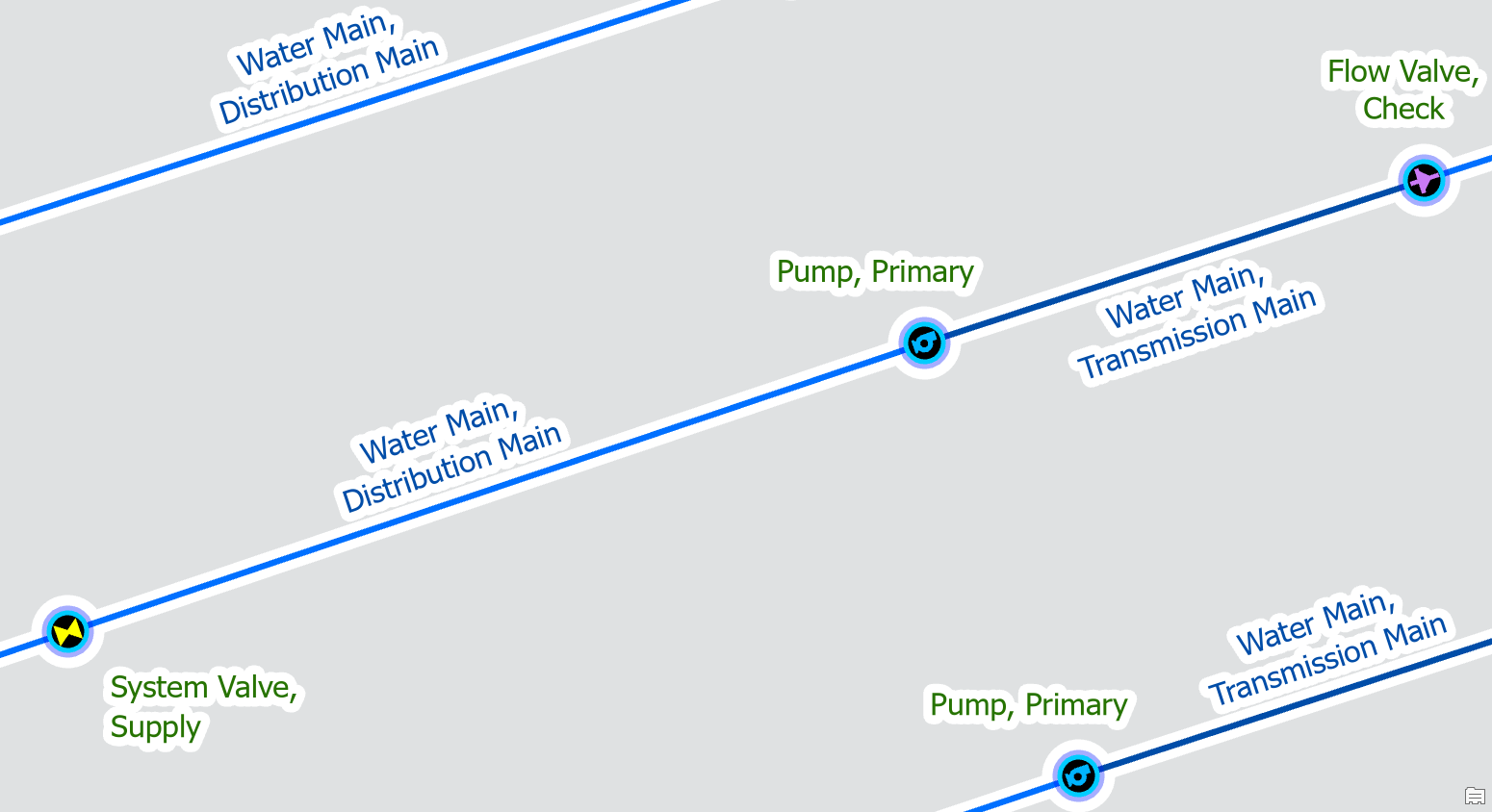 By default, the water model allows transmission main and distribution main to be on both the high-pressure outlet and low-pressure inlet of a pump. This means you must use the terminal connection tool when connecting a main to a pump station to assign it to the right terminal.