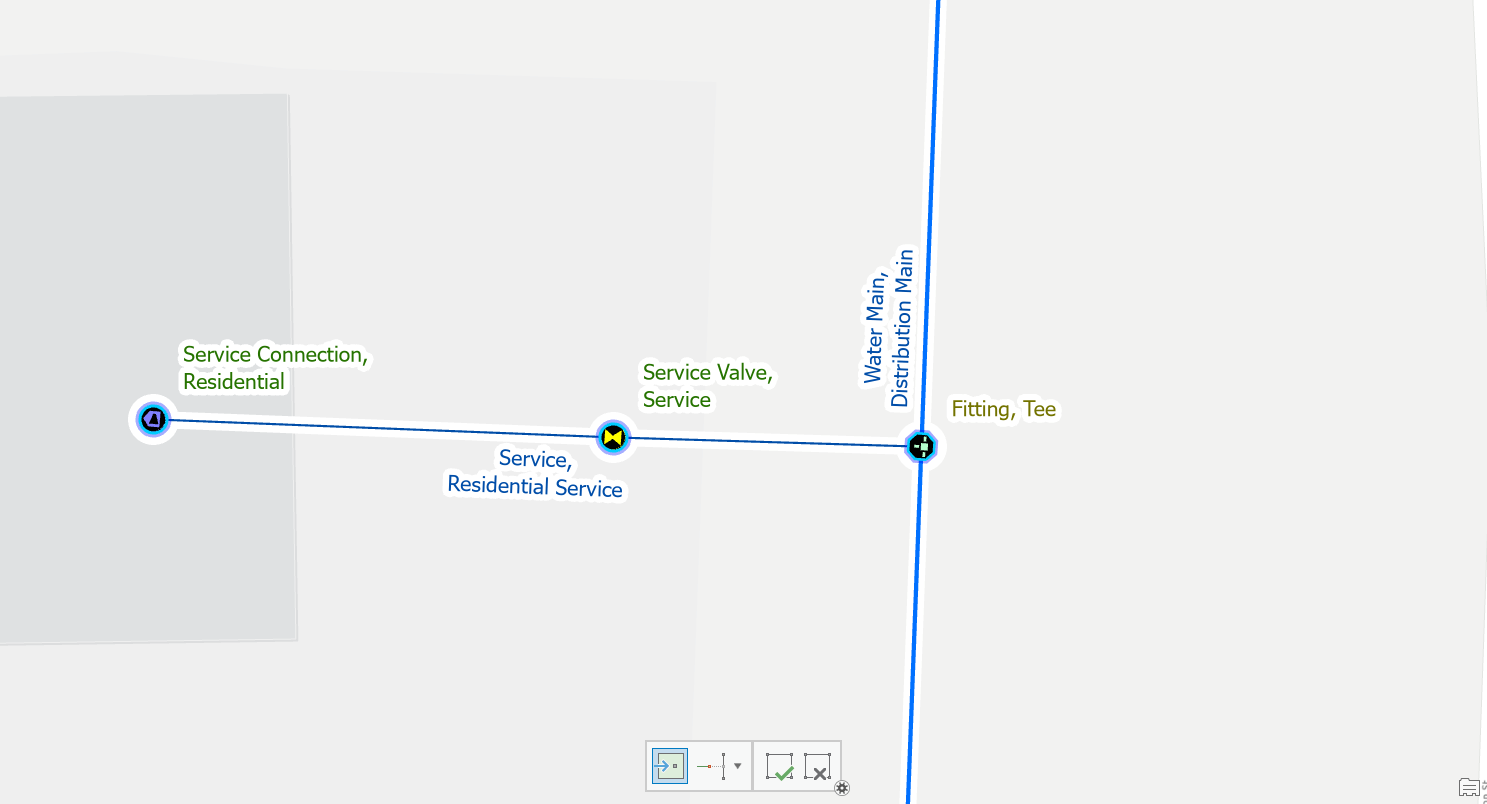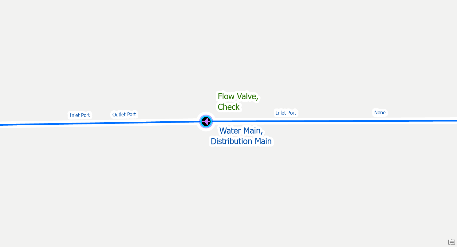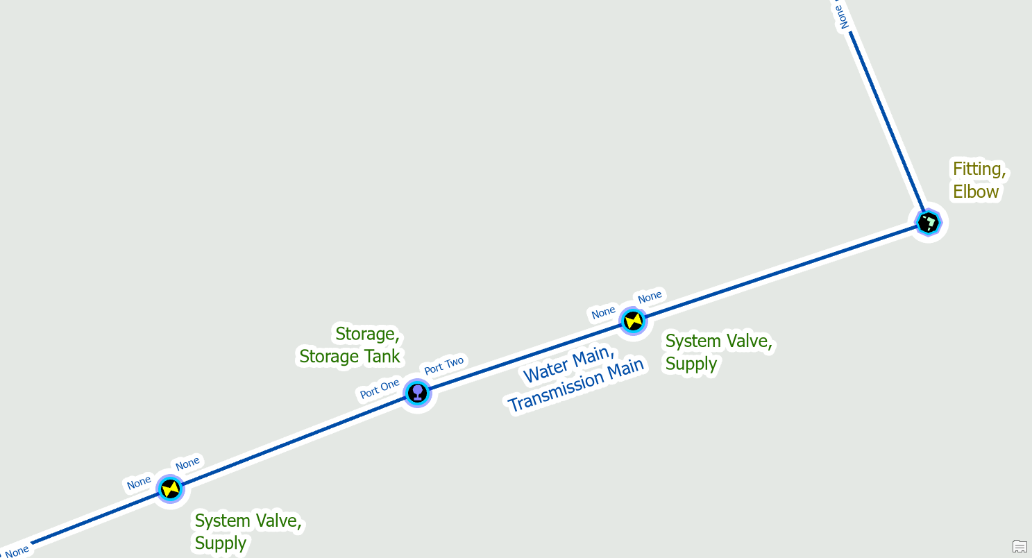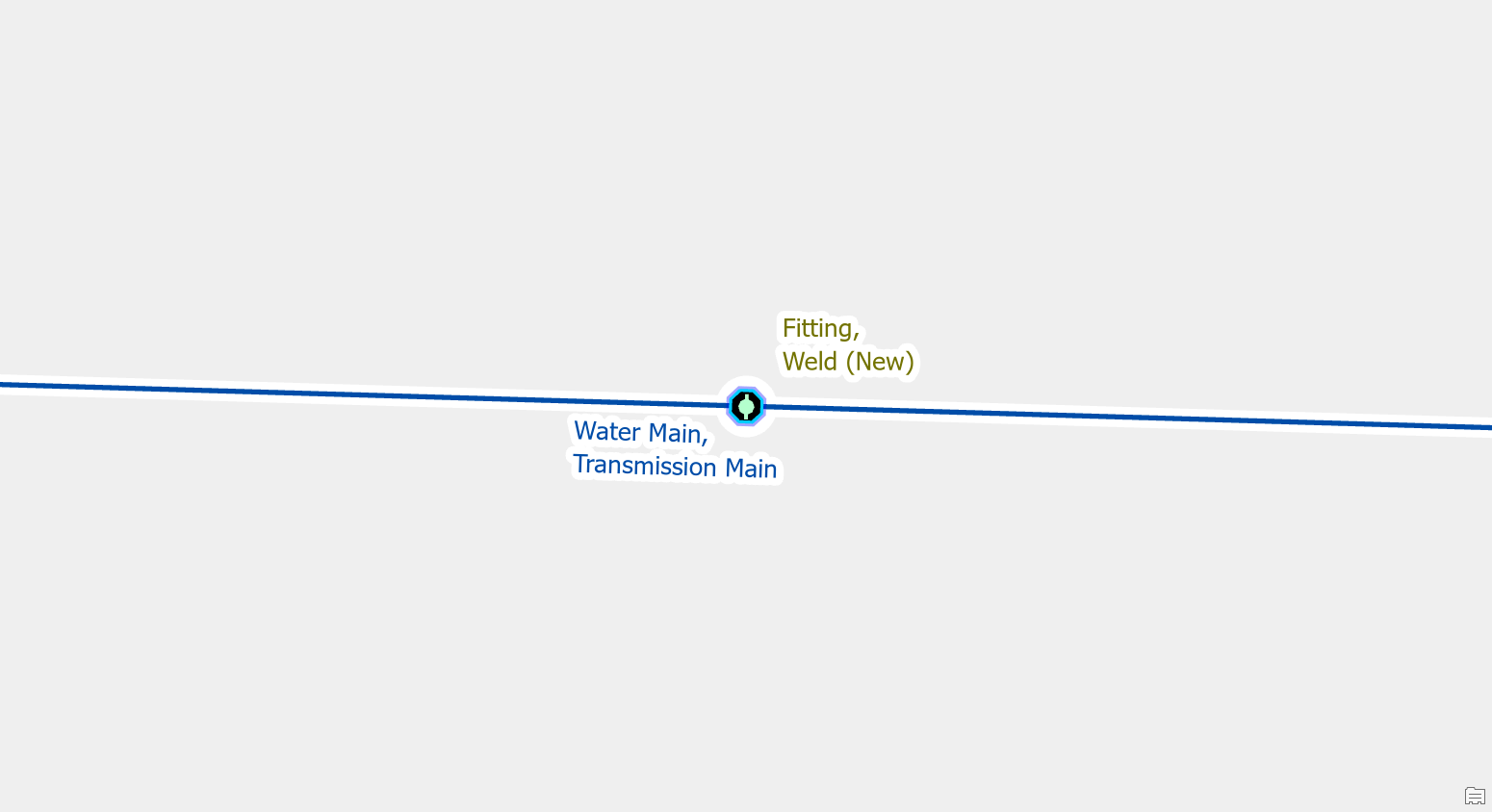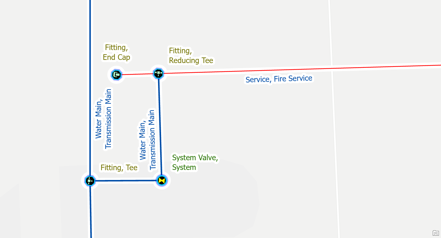 To fix the issue, you would place a fitting at the location where the two pipes are connected. You should make a note or indicator to keep track of these junctions for follow-up. Their location and materials are approximate and will need to be confirmed by referring to source drawings, work orders, or field verification.