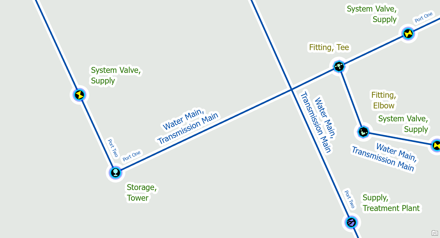 Devices with terminals can only connect to the end of a line. In this example you can see that we’ve placed the water treatment at the intersection of two transmission mains.