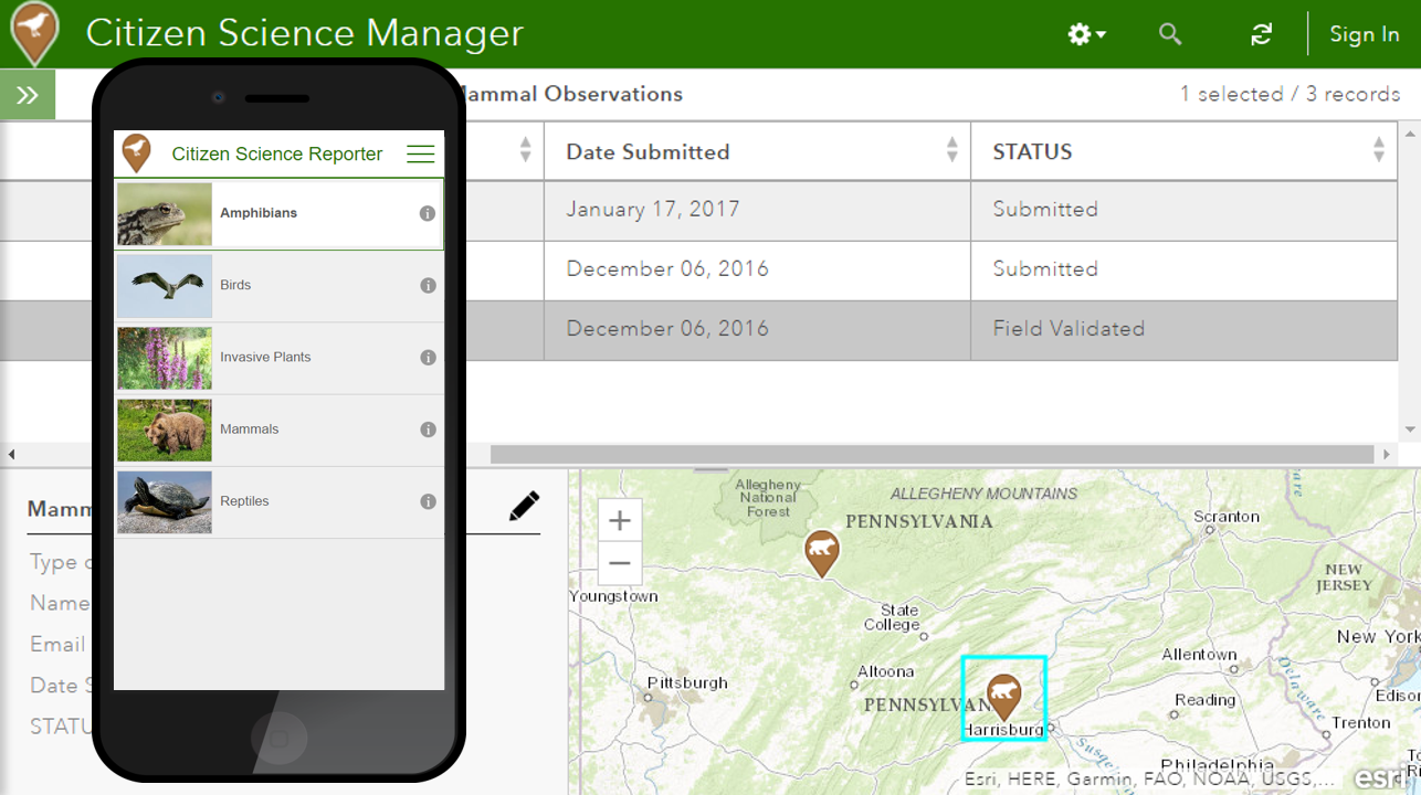 Then, using the Citizen Science Manager application, staff members can review and curate reports. Once reports have been reviewed, the information can then be used to support habitat management and land use decisions.