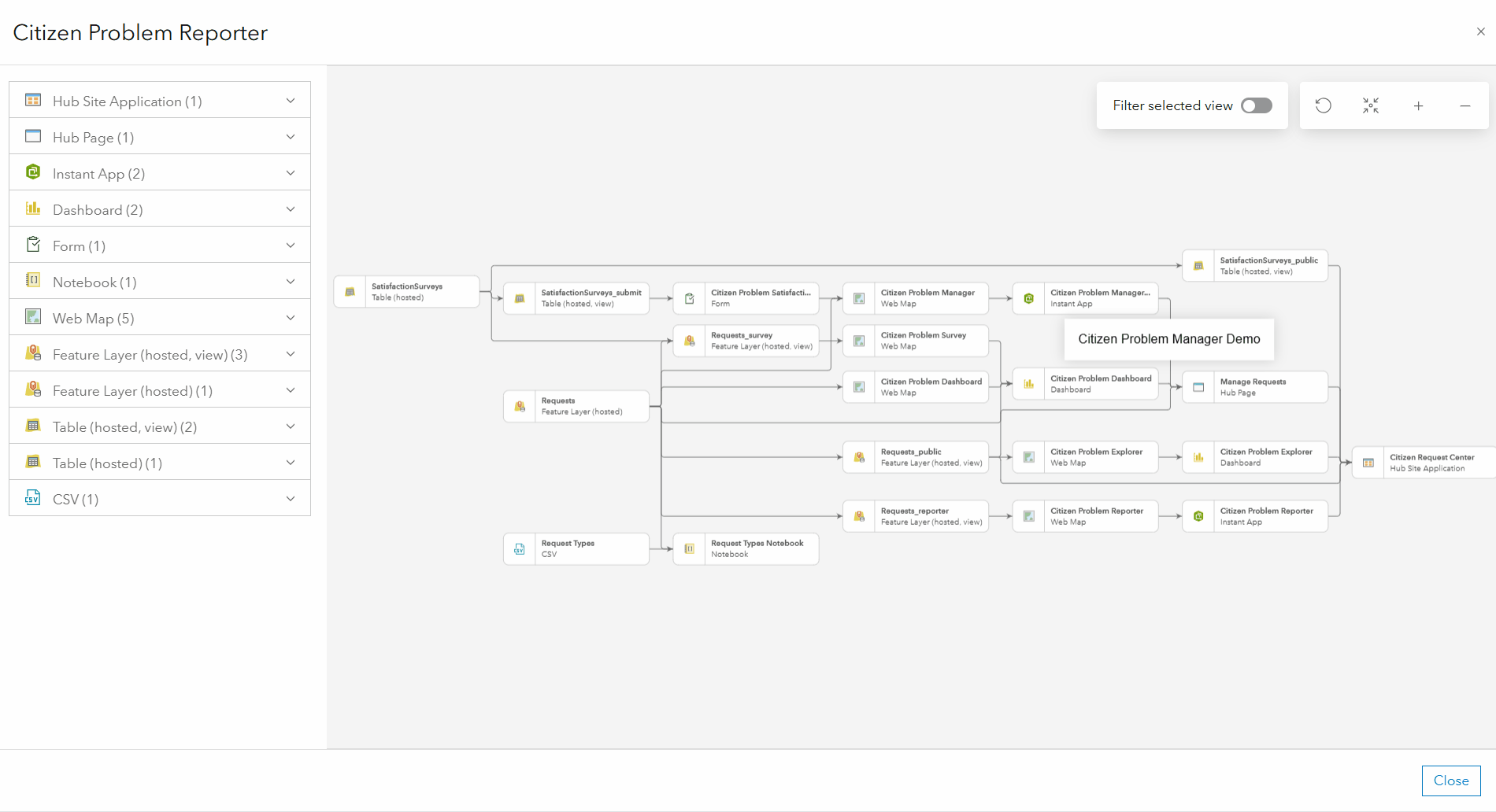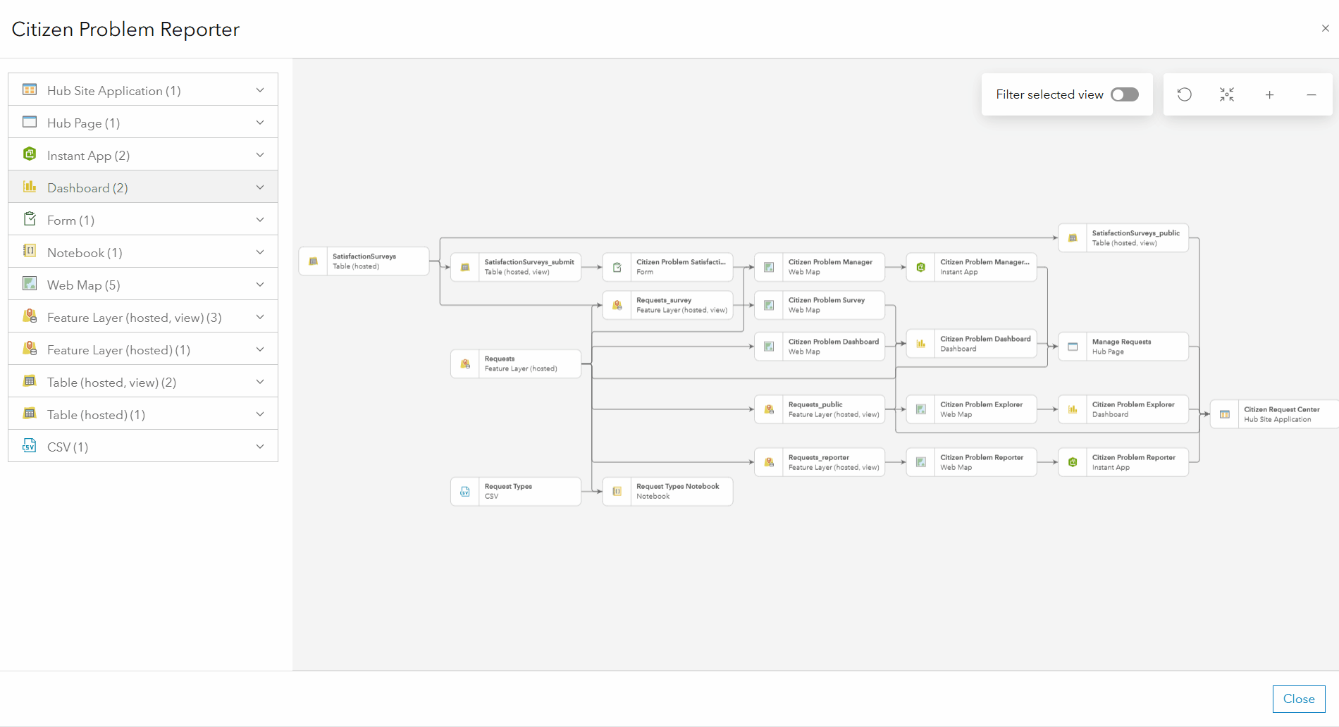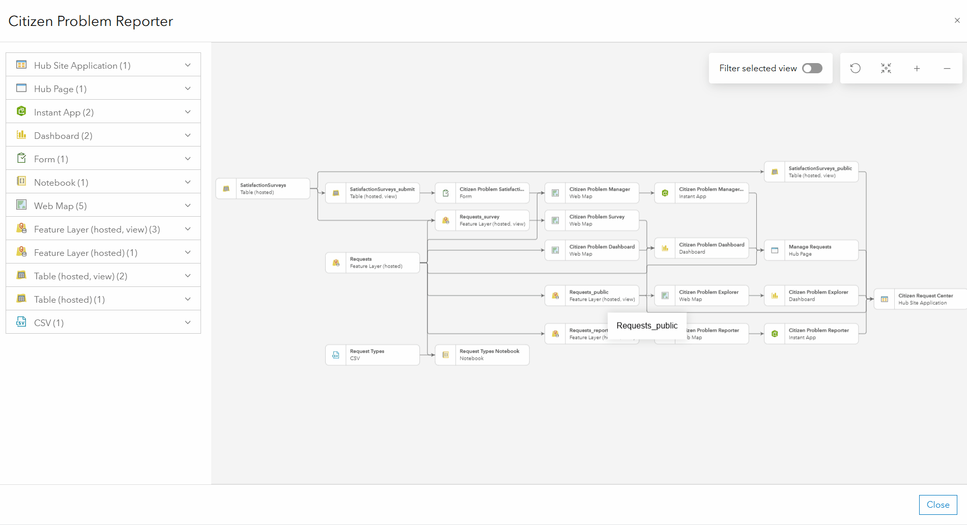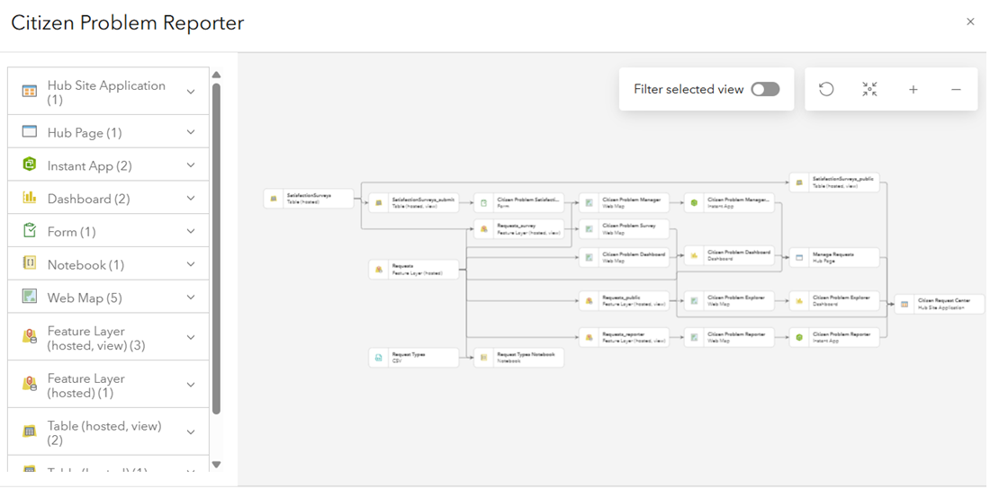 In larger solutions with many items and complex relationships, toggle on the Filter selected view to isolate a single item and visualize only its related components. This makes it easier to work on specific parts of your solution without distraction.