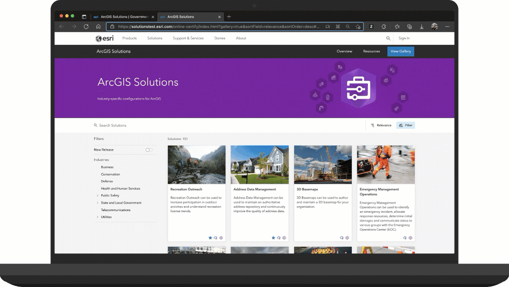 On November 17, 2021, we launched a new product gallery that allows you to browse the entire collection of ArcGIS Solutions before logging in to your ArcGIS organization. This gallery simplifies how users discover ArcGIS Solutions available to their organization.