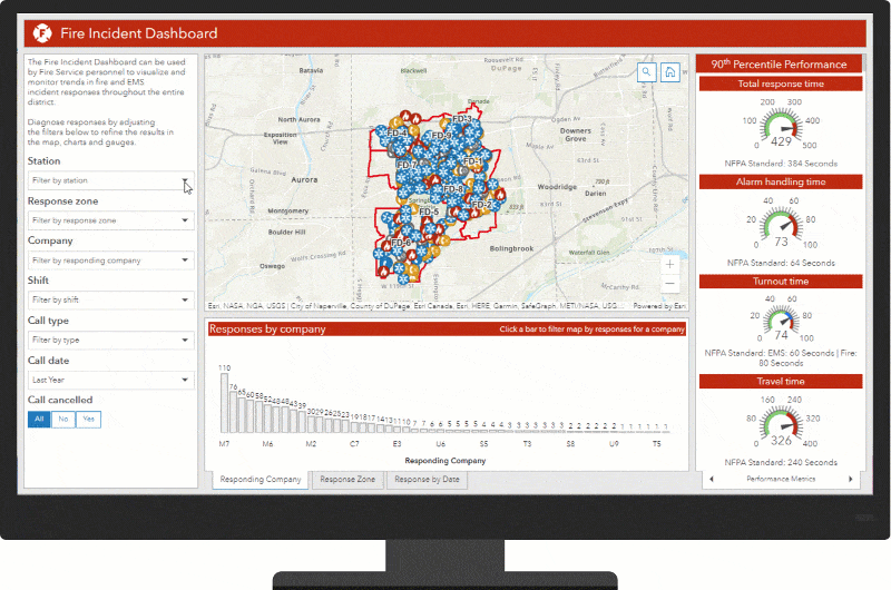 Fire Incident Dashboard can be used to visualize fire and emergency medical service (EMS) incidents sourced from computer-aided dispatch or records management systems and monitor associated response times.