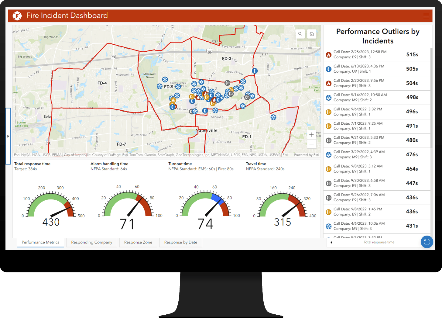 Fire Incident Dashboard can be used to visualize fire and emergency medical service (EMS) incidents sourced from computer-aided dispatch or records management systems and monitor associated response times.