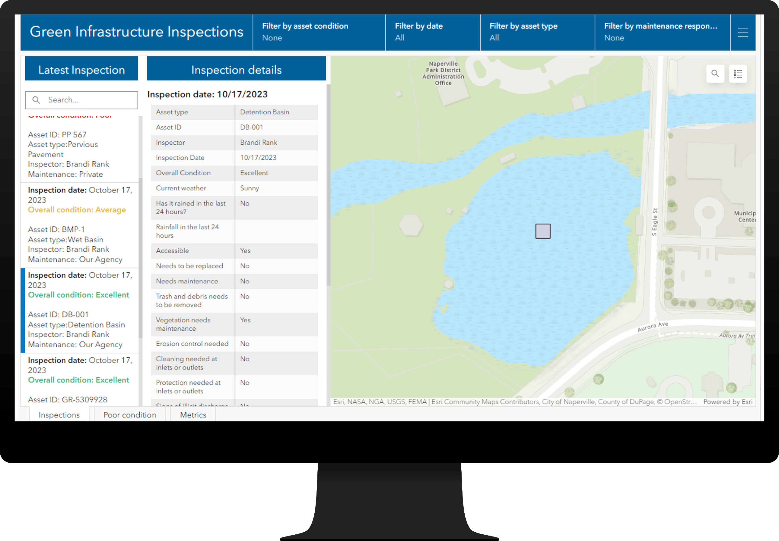 Green Infrastructure Inspections can be used to assign inspections, record inspections in the field, monitor inspection activities and manage private green infrastructure maintenance activities.