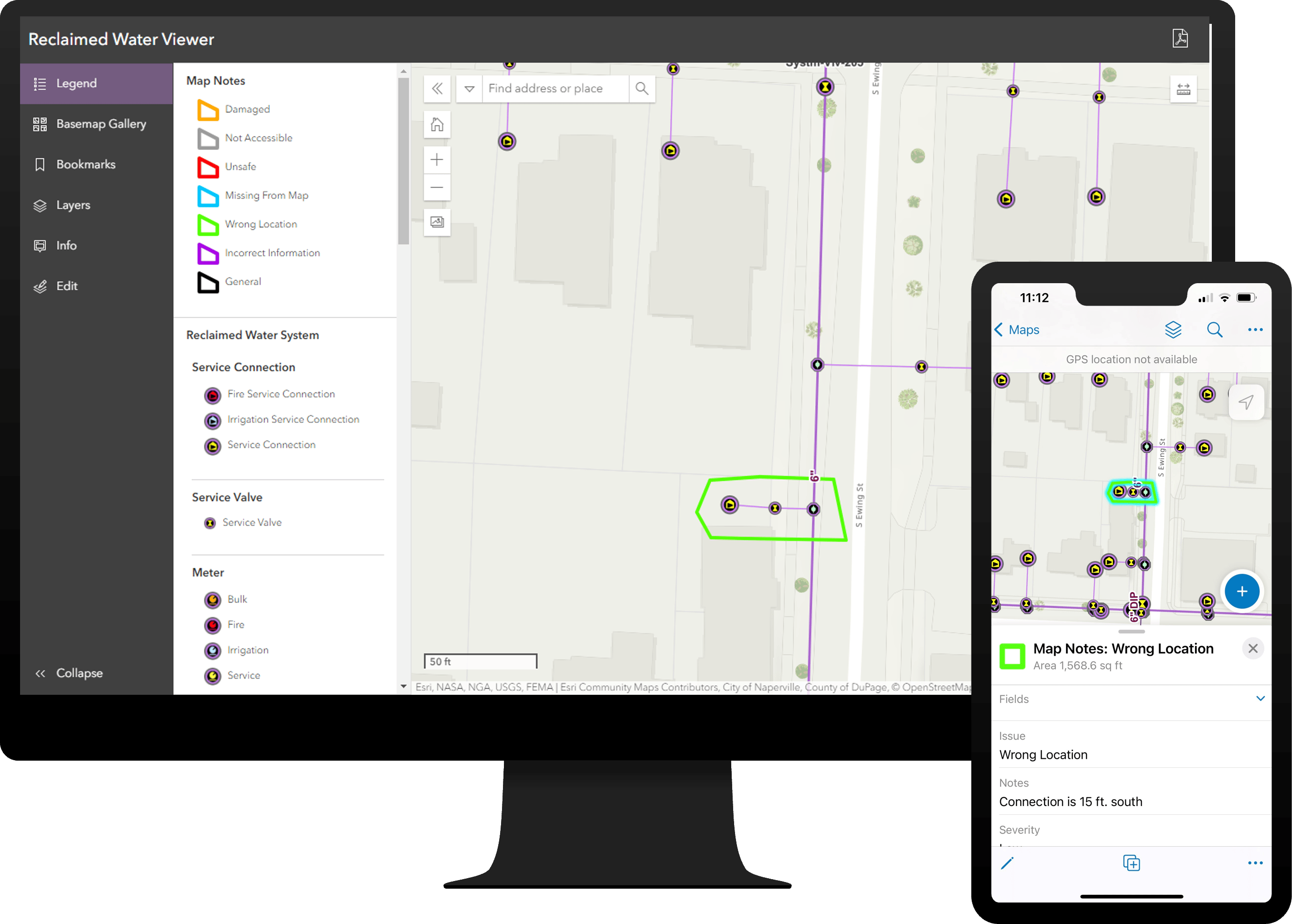 Reclaimed Water Data Management can be used to map reclaimed water assets, edit data, view system maps in the field and office, view asset reports, and collaborate with map notes.
