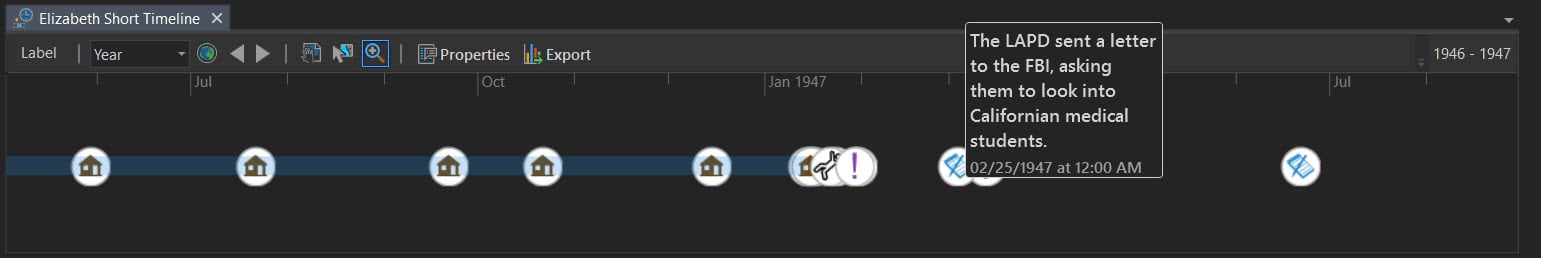 Time image below displays temporal data from the Black Dahlia cold case. The Timeline shows both specific events as points and timespan events with start and end timestamps, plus a point label.