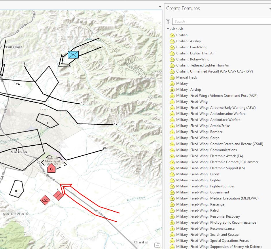 Military Overlay is a Defense Solutions template being released with ArcGIS Pro 1.2 that enables analysts, planners, and other members of the military community to quickly create and share operational plans using the MIL-STD-2525D joint standard military symbology. By using this template, you will be able to quickly create overlays while still adhering to the specifications of the standard. The template leverages the ArcGIS Pro Dictionary Renderer, which enables the creation of multilayer symbology based on several attributes of a feature. In addition, many feature templates are contained in the template, which enable the quick creation of pre-symbolized features. These feature templates are available for each feature class in the military overlay geodatabase. Examples of feature classes and feature templates included are those for military air, land units, sea, and control measure features.