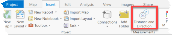 Using Distance and Direction, you can draw geodetic lines, circles, ellipses, and rings to visualize relevant information. Lines, circles, ellipses, and rings are created as features stored in a feature dataset in the project geodatabase and are added to the table of contents. You can export lines, circles, ellipses, and rings to a new feature class, shapefile, or .kmz file for further analysis and planning or use in other systems. The Distance and Direction tools are found in the Measurements group on the Insert tab.