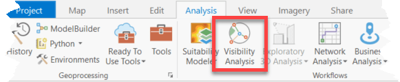 Using Visibility Analysis tools along with elevation data and observer information, you can produce linear line of sight (LLOS) and radial line of sight (RLOS) information. The Visibility Analysis tools can be found in the Workflows group on the Analysis tab.