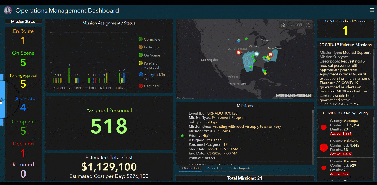 The Operations Management solution leverages Survey123 forms, Web AppBuilder and Dashboards to provide a dynamic method for input and editing of events, missions, status reports, and field reports.